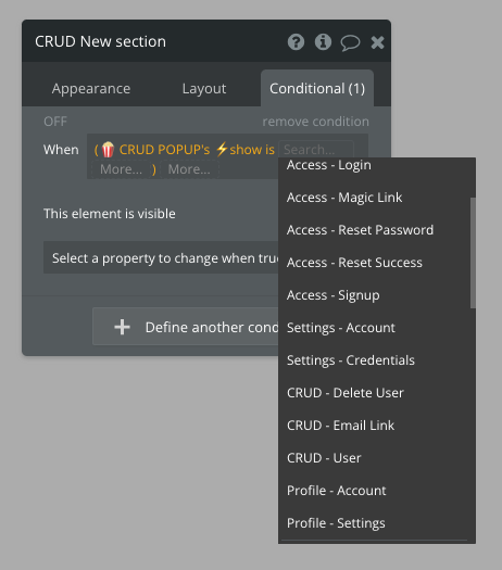 <figure><img src="https://3323346004-files.gitbook.io/~/files/v0/b/gitbook-x-prod.appspot.com/o/spaces%2FW4eajJmOk3q8BX2WzhCG%2Fuploads%2FlHN7lzhMX8566H0vVCFB%2FScreenshot%202022-09-19%20at%2014.54.15.png?alt=media&#x26;token=dd8427ab-f32d-48df-983e-3cb5b2eea4f2" alt=""><figcaption><p>When conditional is true, the CRUD - User section will be visible</p></figcaption></figure>