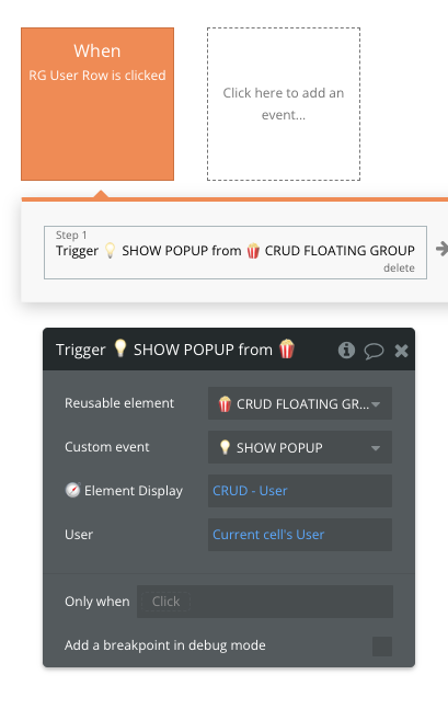 In our case, we are clicking RG User Row which contains information about the User datatype. When clicked we want to trigger the 💡SHOW POPUP workflow from the reusable and the information we need to manipulate the object.