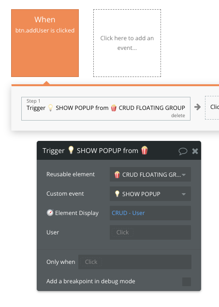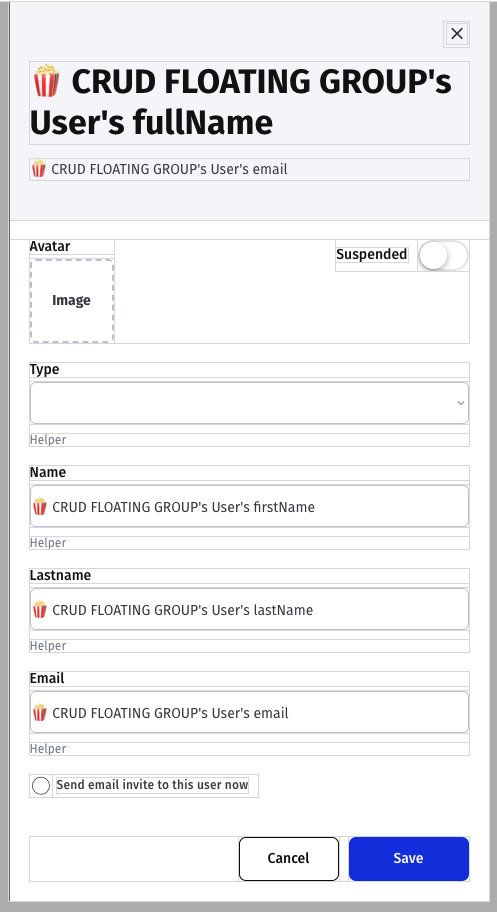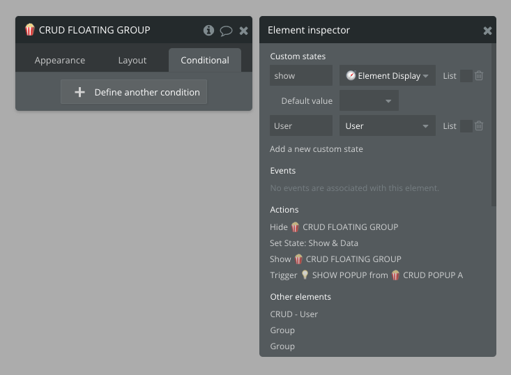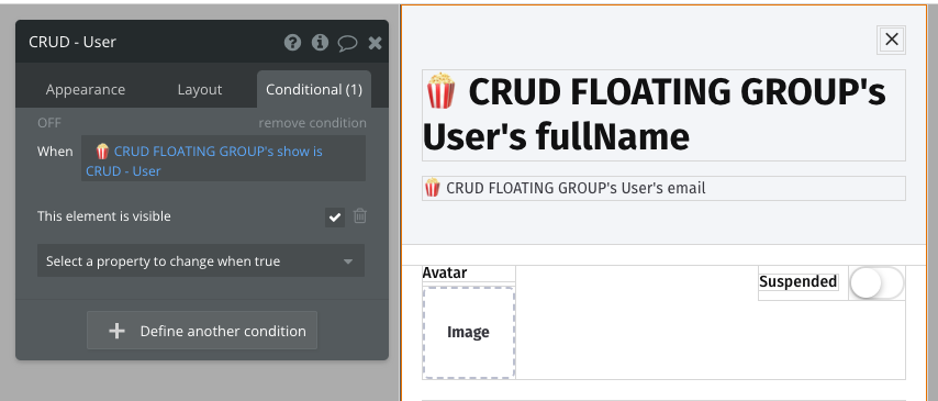 The elements inside the CRUD - User section are referring to the main datapoint which in this case is 🍿CRUD FLOATING GROUP User - the top-level datapoint in the Reusable which values we set with '💡SHOW POPUP' custom event.