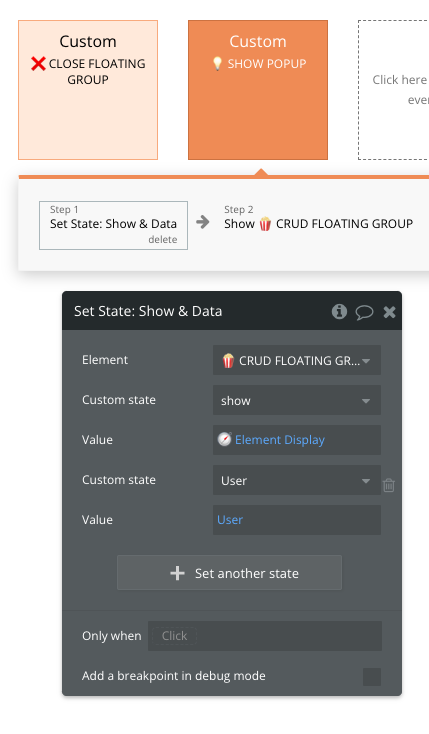In 🍿CRUD FLOATING GROUP and 🍿CRUD POPUP reusable elements you will find a pre-built 💡SHOW POPUP workflow.&#x20;